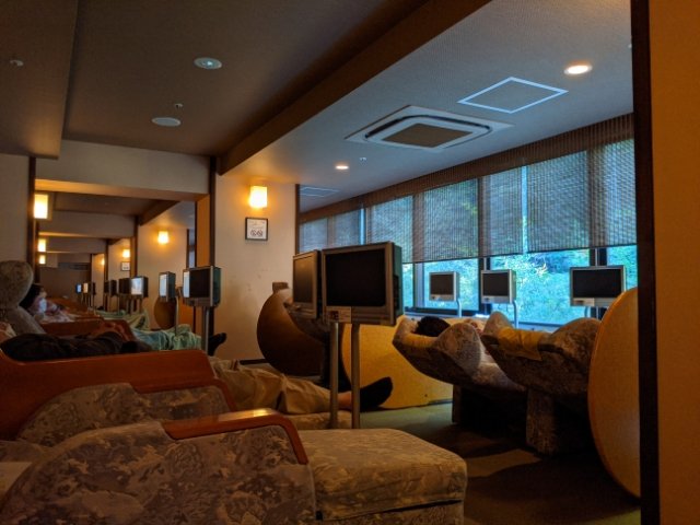 休憩所のリラクゼーションルーム。マンガなどはありませんが、各席TVモニター付き。天成園の日帰り入浴は、深夜料金を支払えば朝9:00まで滞在できます。一晩過ごすならば、ここでばっちり睡眠がとれますね。