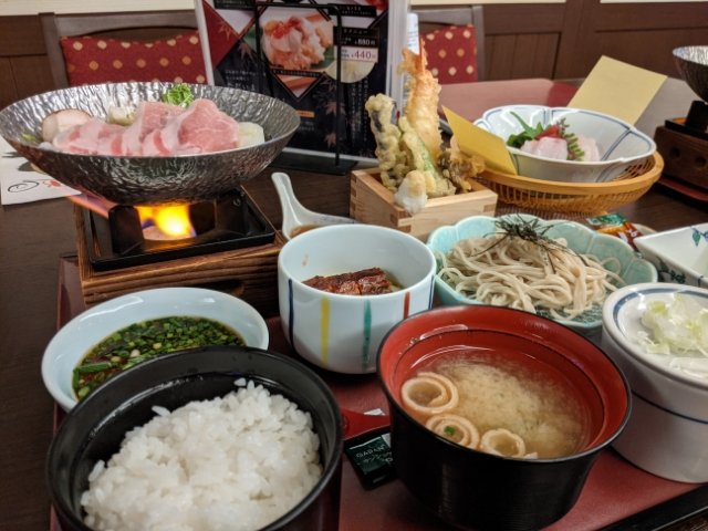 今回は小田急トラベルの食事付プランで申し込んだので、こちらのすくも御膳がセット。箱根山麓豚のお鍋、お刺身、天ぷら、そばなど和食の人気メニューがてんこ盛り!