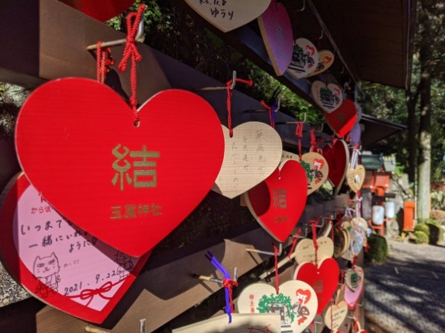 ご利益は家内安全、商売繁盛など。縁結びのパワースポットとしても人気で、かわいらしいハート型の絵馬も奉納されていました。