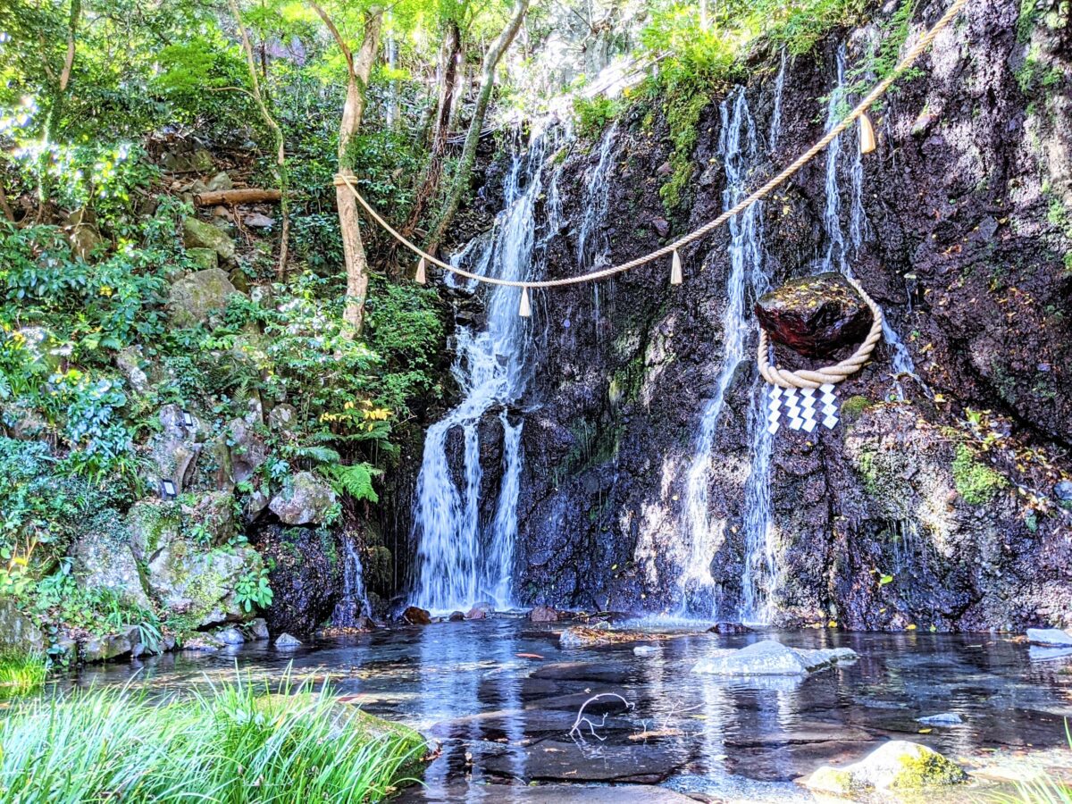 庭園には2つの滝があります。1つ目は玉簾(たまだれ)の瀧。高さ約8m・幅約11mの立派な滝で、ザーザーと音を立てて勢いよく流れています。木の間と岩に掛けられた注連縄が神聖な雰囲気です。