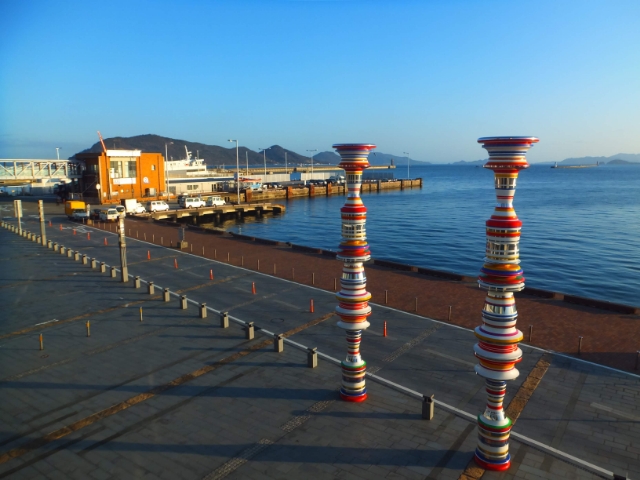 高松駅に6:40に到着、そこから5分ほど歩いて高松港へとやってきました。カラフルなポールは『Liminal Air -core-』by 大巻伸嗣という作品。旅立つ人を見送るようにたたずむ作品は、アートの旅への期待を膨らませてくれます。