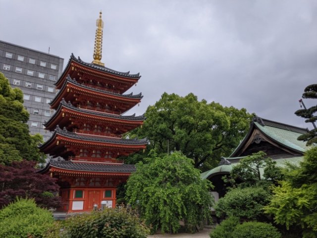 境内でひときわ輝いて見えるのがこちらの五重塔。高さは25.9m。周辺にはビルが立ち並んでいますが、朱塗りの塔の存在感は抜群です。