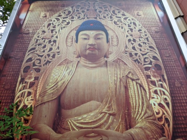 拝観料の50円を納めて中に入ると、薄暗い堂内に静かに鎮座する大仏様のお姿が。厳かな空気に背筋がすっと伸びます。(※写真撮影禁止なので、屋外看板に掲載されていた写真です。)