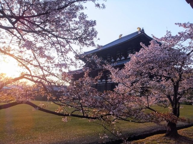 さて、そろそろ閉門の時間です。誰もいなくなった大仏殿に桜と夕陽が組合わさったこの景色、これは4月ならではの美しい光景です。