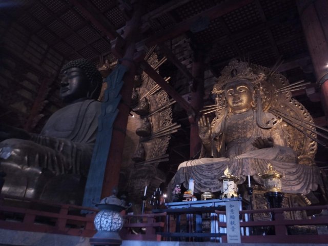 堂内には奈良の大仏以外にも仏像がたくさん。向かって左は虚空蔵菩薩坐像、向かって右は如意輪観音座像と脇侍が両サイドを固めています。