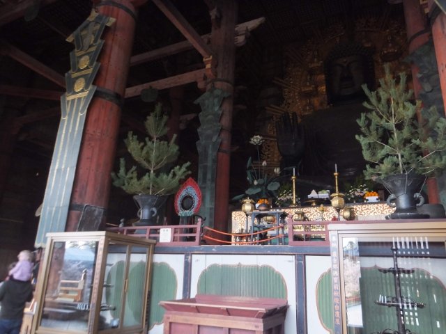 このおびんずる様、日本各地のお寺でも見かけますが、この東大寺のものはかなりの大きさ。さらに高めの台座に乗っているため、がんばってもヒザまでしか手が届きません。ヒザ下に悩みがある方専用、もしくは背が高い人向けのおびんずる様でした。