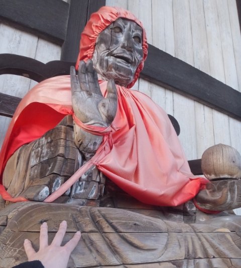 このおびんずる様は、お釈迦様の弟子の十六羅漢のうちの一人。体の悪いと思っているところを撫でて、その後自分の体の同じ場所を撫でると良くなるといいます。人々を救うために、お堂の外で風雨にさらされているなんてなんと心優しいのでしょうか。顔はめっちゃ怖いですが・・・。