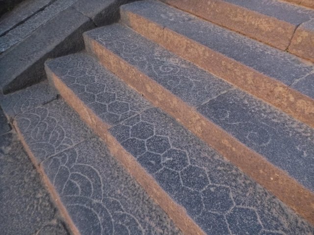 お堂まではゆるやかな石段を登って行くのですが、よく見ると文様が刻まれています。唐草、亀甲、青海波など、一段ずつ違ったデザインとなっているので、目で追って行くととっても楽しい。メジャーな文様も多いので、きっと見たことある柄に出会えるのではないでしょうか?