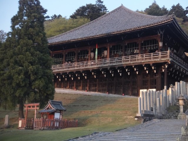 すぐに見えてくるこちらの建物が二月堂。斜面に柱を組んで舞台をつくる「懸造り(かけづくり)」という建築様式が印象的なお堂です。