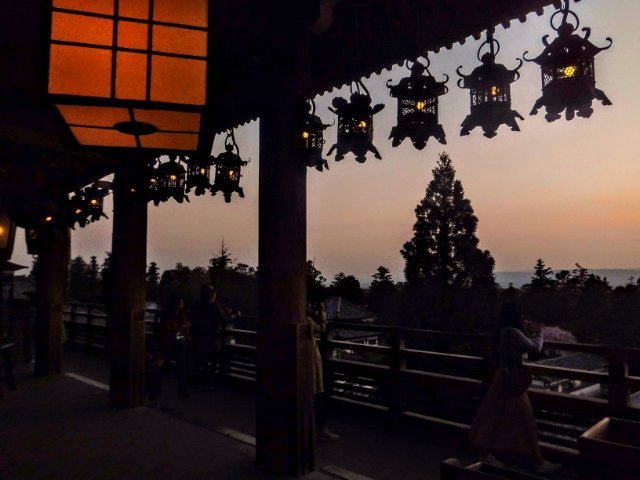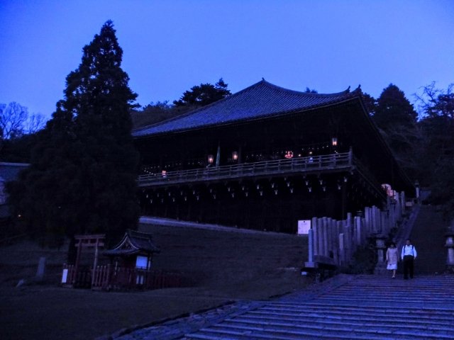 日が沈んであたりが暗くなってきても、ぱらぱらと訪れる人の姿が。こちらの二月堂は、なんと24時間無料開放。