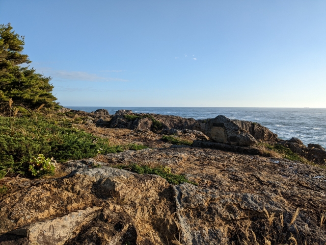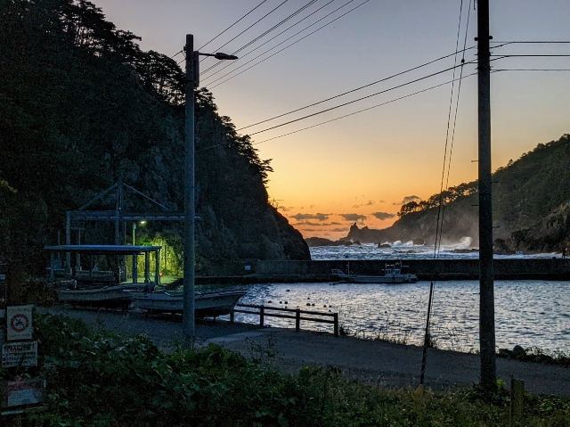 時刻は早朝5:00過ぎくらい。ちょうど日の出のタイミングだったため朝日がキレイ。魹ヶ崎から日の出を見るというアイディアがちらりと脳裏を過りましたが、日の登る前の暗い山道を1時間も歩くのは少し怖かったので、明るくなってからにしました。