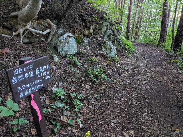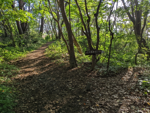 登山口から10分ぐらいのところで、早くも「自然歩道最高地点」の看板を発見。ということは、険しい上り坂はここまで。やったー!