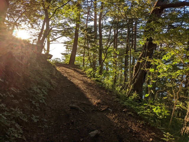 しばらく進むと未舗装の道になっていきます。朝イチで歩く自然の中の道は気持ち良い!とウキウキ気分で脳内BGMがトトロの「さんぽ」になっていたのですが、ここから先はずっとこのような自然遊歩道。ひたすら似たような道が続くので、その楽しさも徐々に薄まっていきます。