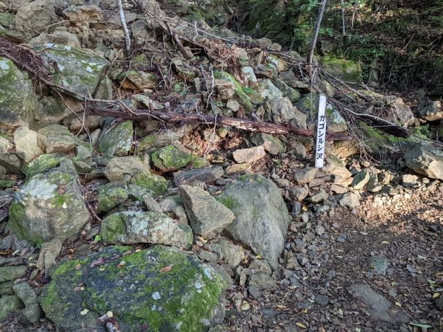 カゴシルシ沢と書かれた標柱。山中で見かけるカタカナの地名に少なからず怖さを感じるのは私だけではないはず・・・・。現在は岩が積もっていますが、かつては水が流れる沢だったのでしょうね。