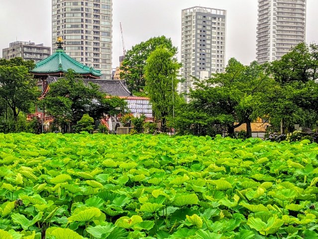 ハスで埋め尽くされた不忍池に浮かぶように建つお堂では八本腕の弁財天を祭っています。