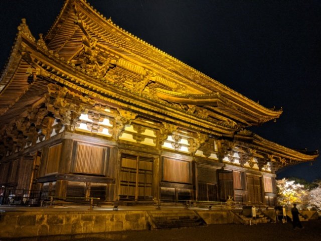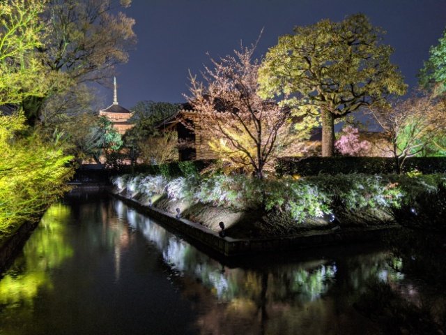 京都駅の程近く、日本一の木造五重塔を有するお寺。春の夜間拝観期間中はサクラや塔が幻想的にライトアップされています。21体の仏像が並ぶ立体曼荼羅は圧巻です。