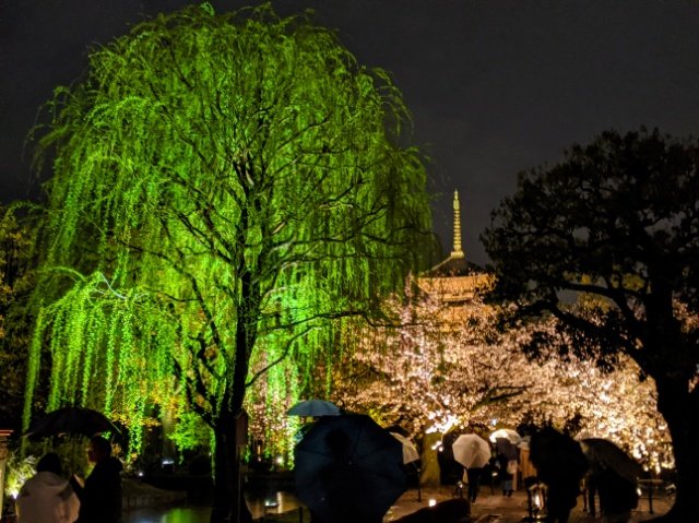 どうしてもサクラに目が行ってしまいますが、ライトアップされた柳も非常に美しい。暗闇にグリーンが映える様子が凄く新鮮です。