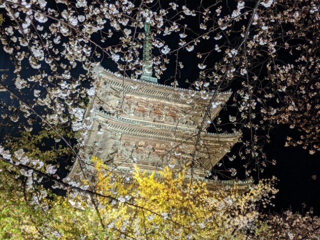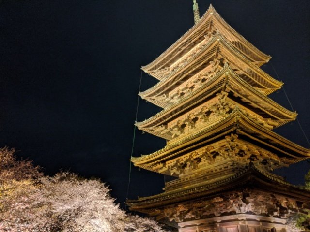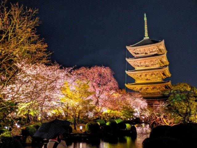 京都のいくつかの観光スポットはサクラの季節にライトアップや夜間拝観を開催しておりますが、この東寺もそんな夜桜スポットの1つ。