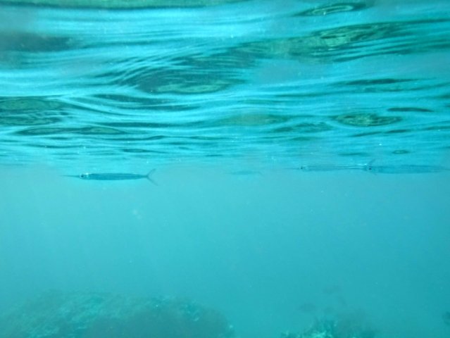 ふと海面を見るとサヨリの群れがスイーッと通り過ぎて行きました。最初ダツかと思ったのですが、「群れをなしてる」「40cmくらい」「まっすぐ泳ぐ」あたりからサヨリっぽい気がします。