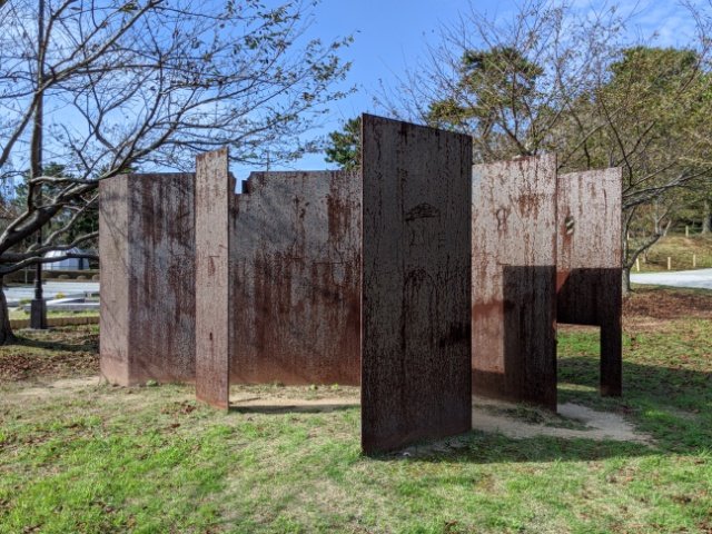 錆びついた鉄板が並ぶ小さな迷路のようなルックス。よく見ると鍵のカタチをした穴があちこちに空いています。相合傘や名前の落書きが多数刻まれており、意図していたのかは定かではありませんが、ある種の参加型作品のような体をなしています。