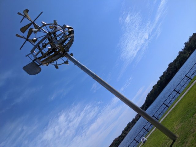 車輪のついた蒸気船のようなカタチをした風車で、高さは12mとかなり大きいです。風を受けるとあちこちのパーツが回転するのですが、全て回るにはかなりの強風が必要です。