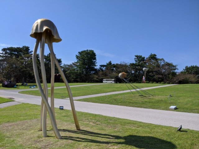 湖から爽やかな風が吹く芝生の丘に並ぶ作品群。天気の良い日はとっても清々しい中でアート鑑賞が楽しめます。