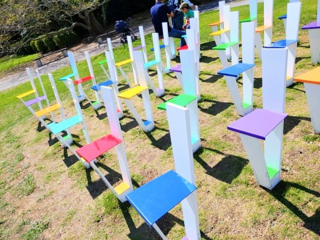 36脚のカラフルな椅子が並ぶ。この椅子は実際に座ることができ、さらに回転させることもできる楽しい作品です。大人数で座って記念撮影したら楽しそう!36人集まれば最高なのですが、なかなか難しいですね。