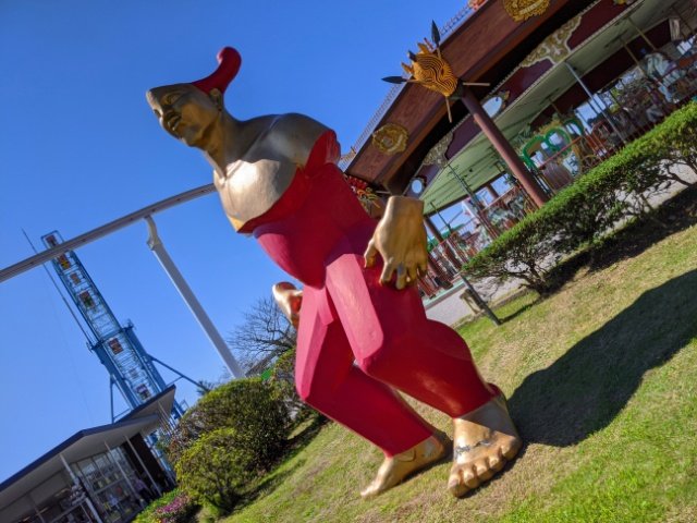 不思議なデザインの頭をした、まるで道化のような作品。温羅(うら)というのはかつて岡山県の吉備地方に暮らしていたとされる鬼で、桃太郎に出てくる鬼の正体ともいわれています。異国からやってきた渡来人との説もあり、この独特のファッションとカラーリングには、その雰囲気がよく表れています。