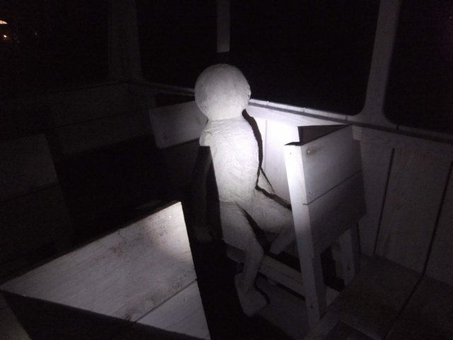 後ろから2列目には、乗客が一人だけ乗っていました。この人はどこかへ出かけるのか、それとも地元に帰るのか。あれ、運転手はどこへ行ったのでしょうか?