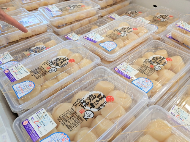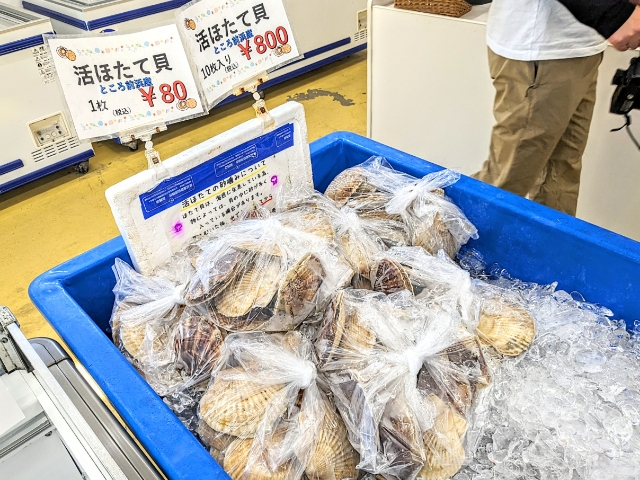 ここでは新鮮なホタテがとってもリーズナブルな値段で販売されています。お値段はそのときによって変わる可能性がありますが、訪問した2023年10月時点では「活ホタテ貝」が1枚なんと80円。自販機のジュースよりも安いです。