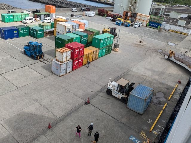 船員さんたちのフォークリフトさばきがあざやか!コンテナにまっすぐフォークを差し込み、次々と船内へ。フォークリフトはコンテナを持ち上げたあとはバック運転に切り替わるのですが、後ろ向きでなんであんなにすいすい走れるのでしょうか。匠のワザに惚れ惚れしてしまいます。