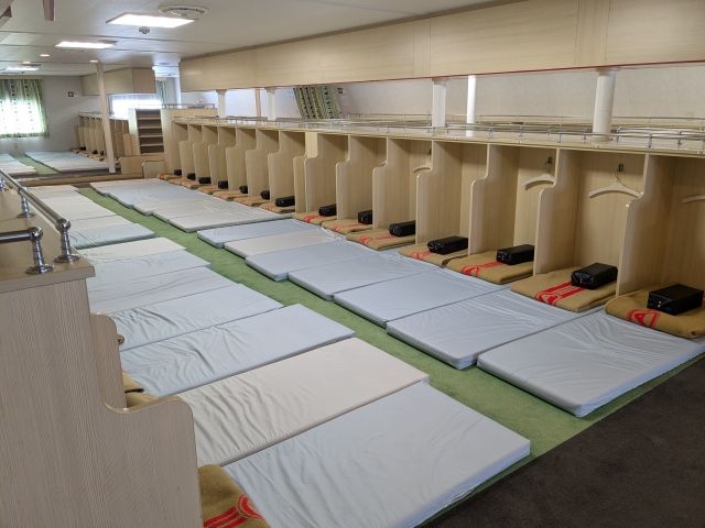 船室は行き先毎に分かれています。2等はこちらの寝転がり席。毛布と枕、枕元には敷居があります。コンセントが近い席は一部しかないので、寝ながら充電したい方はお早めの乗船がおすすめ。