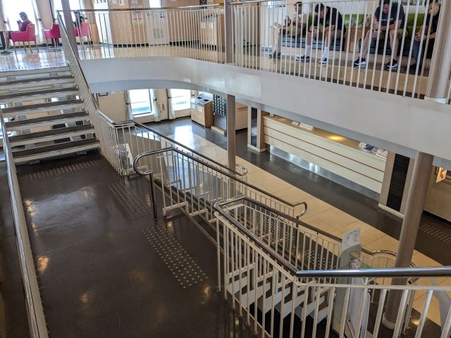 カウンター、ショップなどがある広々としたロビー。椅子やテーブルもあるので、のんびりと過ごすこともできます。