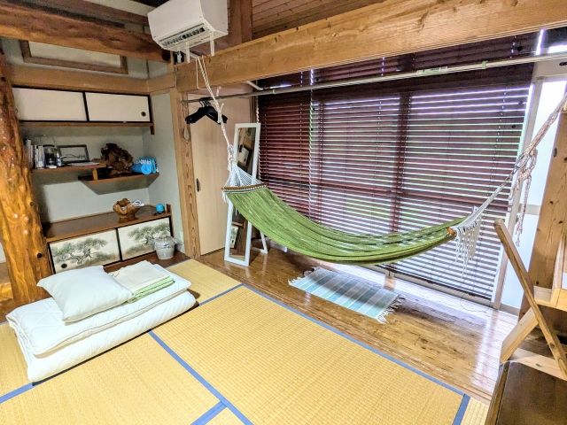 ゲストルームは情緒あふれる畳敷タイプのお部屋。部屋内にはエアコン、扇風機、ハンガーがあります。備え付けのハンモックは、一度乗るとあまりの快適さになかなか降りられなくなるので要注意。