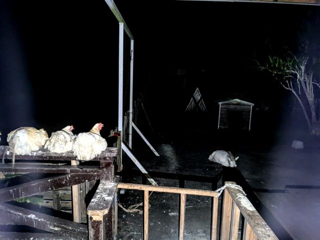 日が沈み夜になるととっても静か。静かにカーテンを開けてみると、ヤギもニワトリもすっかり寝ていました。