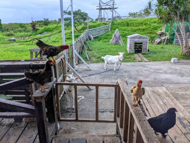 与論島からフェリーに乗り、16:30に到着した徳之島。レンタカーで寄り道しながら、宿に着いたのは18:00頃。スタッフさんとともに飛び出してきたのがヤギとニワトリ!!もうこの時点で、最高すぎます!!