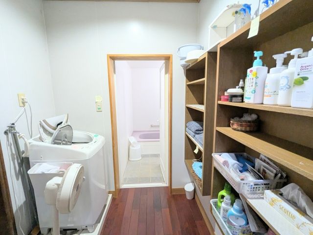 洗濯機は自由に使用OK!隣のラックには洗剤類に加えて、無添加せっけん、大島椿、アミノ酸などの石鹸類が揃っています。好きなモノを選んで自由に使って良いとのこと。