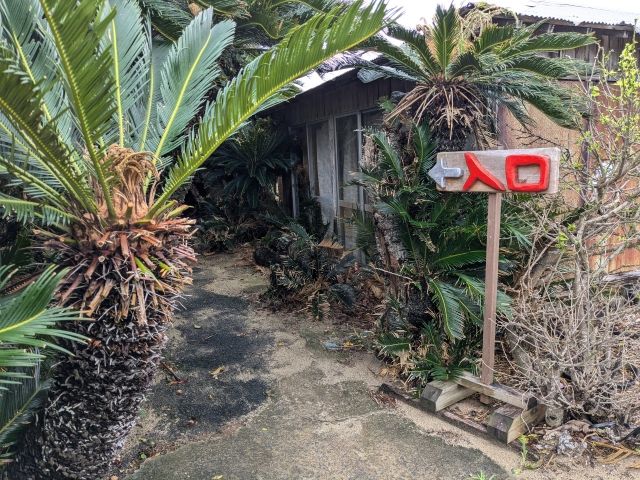 島の北東にあたる金見崎には、ソテツの群生でできたトンネル状のアーチがあります。入口までの車道は細くちょっとだけ分かりづらいのですか、近くまで来れば「入口」と書かれた看板がアピールしてます。駐車場は、トンネル入口の少し先に広場のようなスペースがありました。