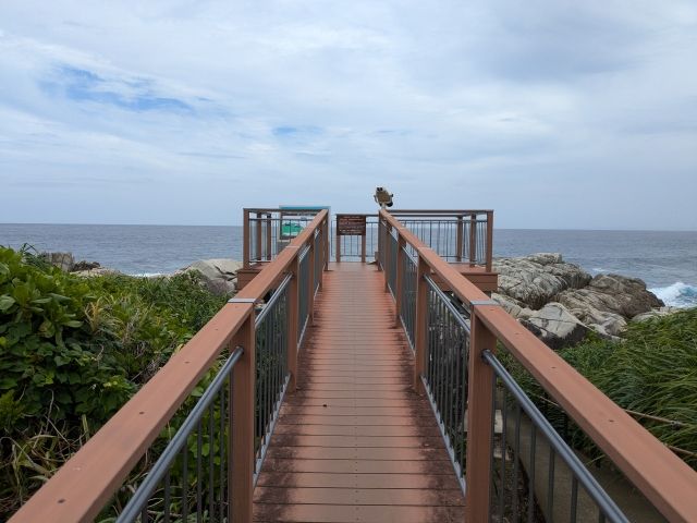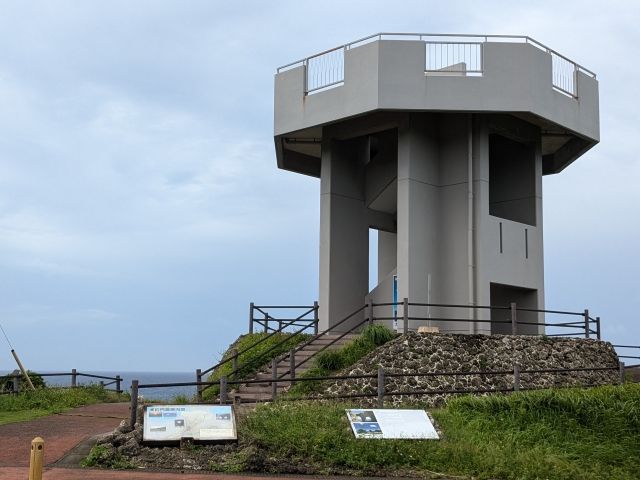 駐車場の目の前にそびえ立っている展望台。12〜4月は、ここからクジラが見えることもあるそう。