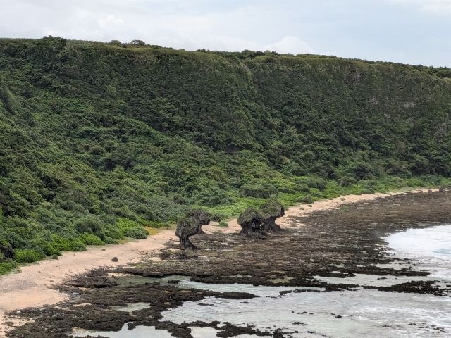展望台の南側はウミガメに会えるという千間海岸。砂浜にはキノコ岩と呼ばれる奇岩群が見えます。一箇所にだけ集まっている様子が不思議な景観ですが、それも含めてキノコ感あります。