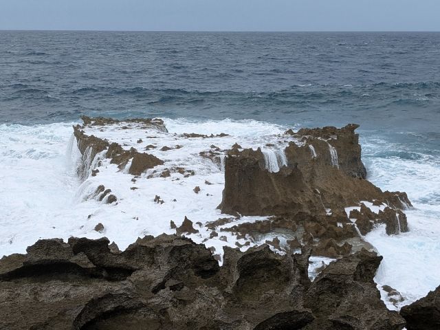 この周辺は荒波が打ち寄せる断崖。めがね岩に限らず、ダイナミックな地形がたくさんあります。荒れていても水色のキレイな海と、ダークブラウンの岩は、まるでチョコミントみたいな色合い。