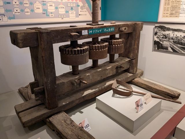 こちらはサタグルマ。サトウキビを搾り、黒糖造りを行うための道具です。