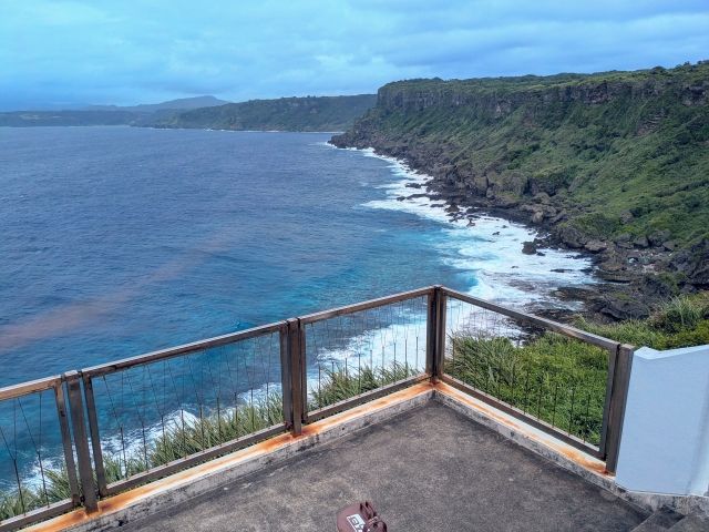 芝生広場の先にある展望台に登ると、目の前には連なる断崖絶壁。青い海からは高波が打ち寄せます。訪問した日はかなりの強風で、展望台の上に立つとそのまま空へ飛び立てそうな勢いでした。