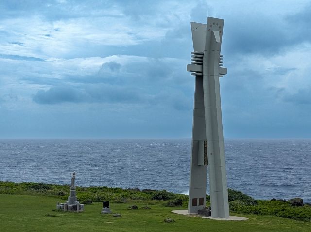 さらに先へ進むと見えてくるのは巨大なモニュメント。こちらは昭和43年(1968)に建立された戦艦大和の慰霊塔。第二次世界大戦末期、山口県徳山港から沖縄へ向かう途中沈没した戦艦大和の慰霊塔であり、大和の司令塔と同じ24mの高さに造られています。