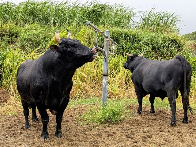 なくさみ館のすぐそばにある牛舎に行ってみると、黒く猛々しいウシの姿が!牧場で見かける乳牛や肉牛とは異なる、たくましいボディ。止まっているのにあふれ出る強者オーラは、凄い迫力でした!