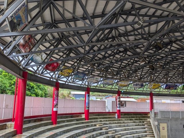 ドームの上部にはスポンサーの看板がずらり。島内の様々な会社の名前が並んでいます。