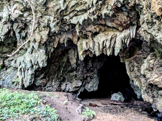 すぐに見えてくるのは大きな横穴。氷柱のように伸びる岩が凄い迫力です。辺りに流れる水の音と、虫のような鳥のような不思議な鳴き声が響き渡り、不思議な世界。