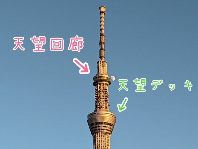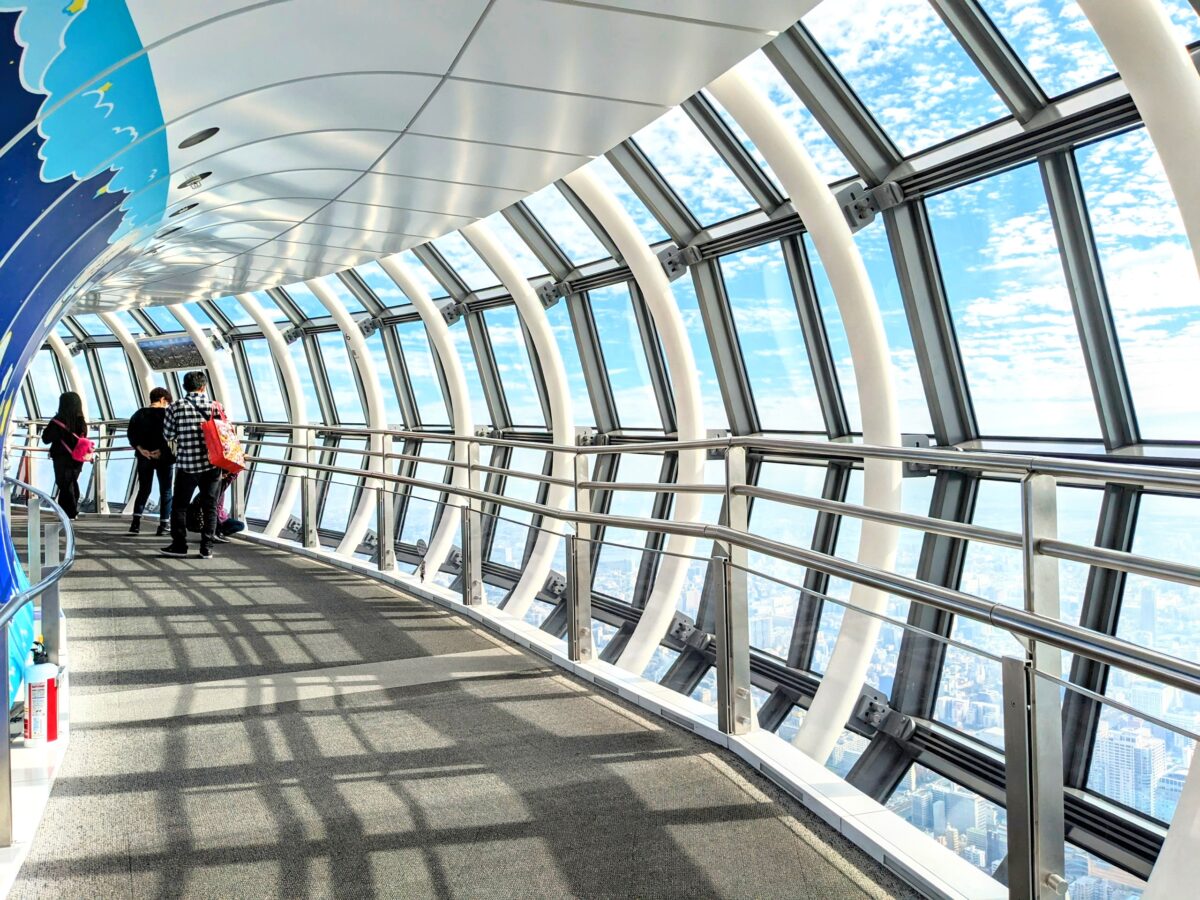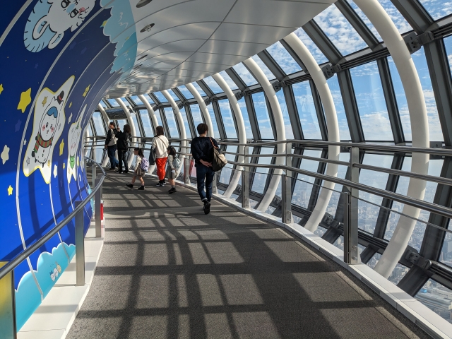 地上から350メートルの高さにある「天望デッキ」、さらに地上450mの「天望回廊」という2つのパートに分かれた展望台が設置されています。