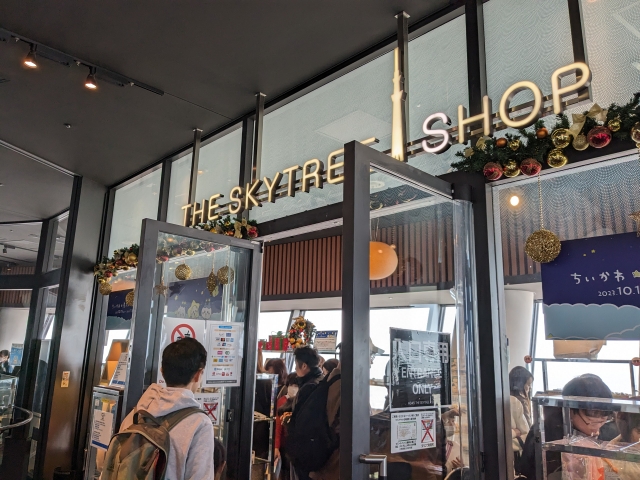 天望回廊からの下りエレベーターは一気に地上へは戻れず、天望デッキのフロア345を経由します。ここはスカイツリーグッズがそろう「スカイツリーショップ」が入っております。