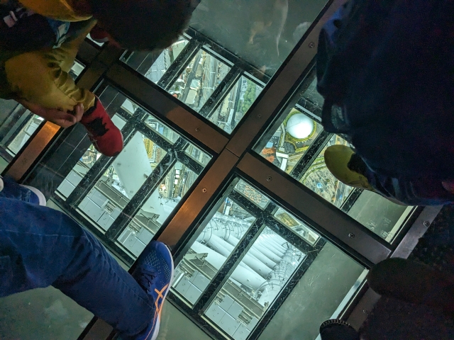 地上への帰りは、その下のフロア340。ここには恐怖のガラス床があります。子どもたちは全然平気で大はしゃぎしてますが、大人の方が躊躇っている感じです。個人的には、高過ぎて逆に怖さを感じなかったです・・!